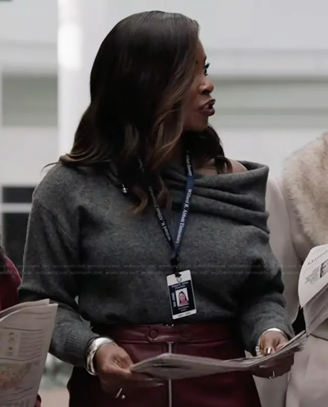 Ava Coleman (played by Janelle James) on Abbott Elementary on ABC was spotted wearing this gray ring detail sweater on Abbott Elementary on episode 'Heroes' (5x11) in Jan 2026. Ava's Sweater is the ZW Collection Yung Aralash Plash Yubka by Zara.