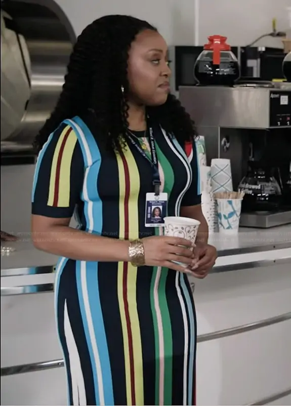 Janine Teagues (played by Quinta Brunson) on Abbott Elementary on ABC was spotted wearing this rainbow stripe bodycon dress on Abbott Elementary on episode 'Heroes' (5x11) in Jan 2026. Janine's Dress is the Unrugby Maxi Dress by The Elder Stateman.