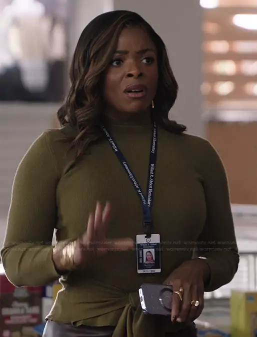 Ava Coleman (played by Janelle James) on Abbott Elementary on ABC was spotted wearing this green tie front top on Abbott Elementary on episode 'Heroes' (5x11) in Jan 2026. Ava's Top is the Knot Knit Sweater by Zara.