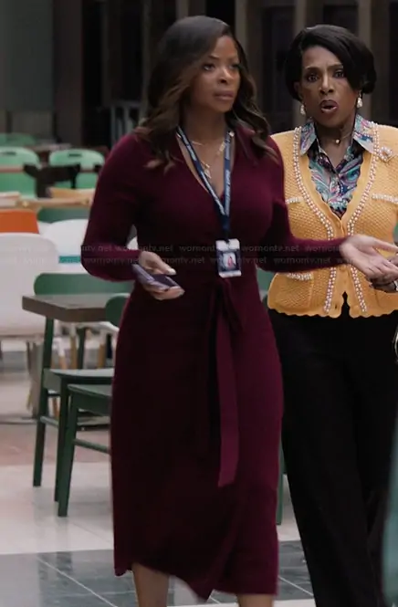 Ava Coleman (played by Janelle James) on Abbott Elementary on ABC was spotted wearing this burgundy tie front wrap dress on Abbott Elementary on episode 'Heroes' (5x11) in Jan 2026.