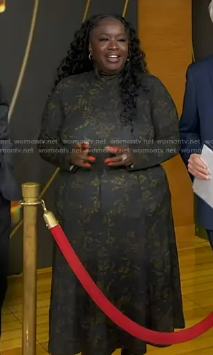 on Good Morning America on ABC was spotted wearing this black floral dress on Good Morning America on Jan 22 2026's episode. 's Dress is the Thea Turtleneck Midi Dress in Black Forest by Tanya Taylor.