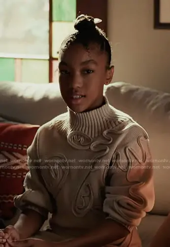 Mara Driskell (played by Askyler Bell) on 9-1-1 on ABC was spotted wearing this beige embroidered knit sweater and skirt on 9-1-1 on episode 'Fighting Back' (9x09) in Jan 2026. 's Set is the Kids Deva Set by Cult Gaia . 's Shoes is the Samba Jane Shoes Kids by Adidas.