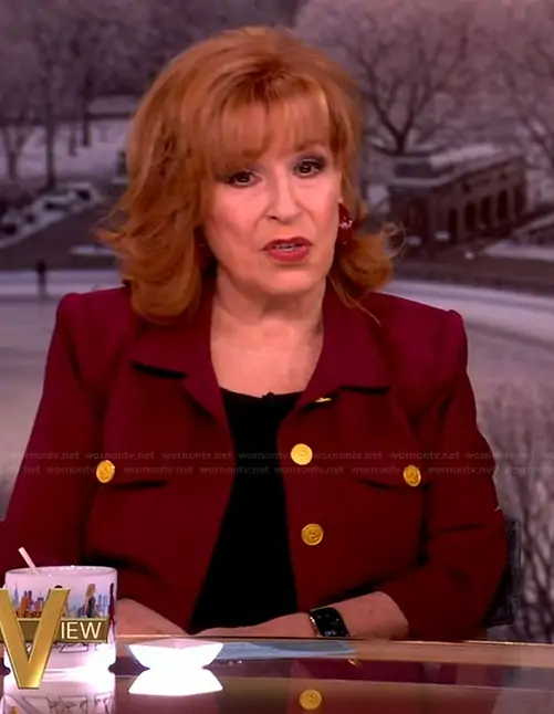 Joy Behar on The View on ABC was spotted wearing this red gold button jacket on The View on Mar 17 2026's episode. Joy's Jacket is the Kumi Button Front Crop Jacket by L'Agence.
