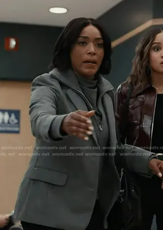 Athena Grant (played by Angela Bassett) on 9-1-1 on ABC was spotted wearing this grey layered blazer on 9-1-1 on episode 'Fighting Back' (9x09) in Jan 2026. Athena's Jacket is the Frank Mixed Media Blazer by Rag & Bone.