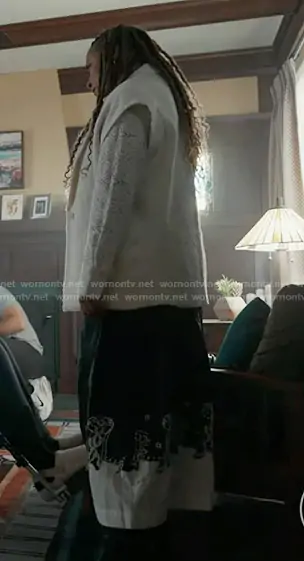 Karen Wilson (played by Tracie Thoms) on 9-1-1 on ABC was spotted wearing this navy printed colorblock pants on 9-1-1 on episode 'Fighting Back' (9x09) in Jan 2026. Karen's Pants is the Jellyfish Printed Skirty Culotte Pants by Maeve.