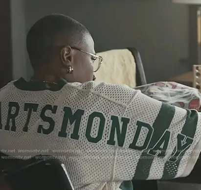 Henrietta Wilson (played by Aisha Hinds) on 9-1-1 on ABC was spotted wearing this green stripe mesh top on 9-1-1 on episode 'Fighting Back' (9x09) in Jan 2026. Hen's Top is the Knitted Mesh Jersey by Diet Starts Monday.