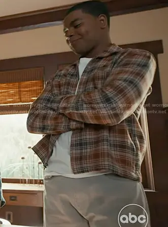 Harry Grant (played by Elijah M. Cooper) on 9-1-1 on ABC was spotted wearing this brown plaid shirt on 9-1-1 on episode 'Fighting Back' (9x09) in Jan 2026. Harry's Shirt is the Alton Plaid Zip-Up Shirt Jacket by Obey.