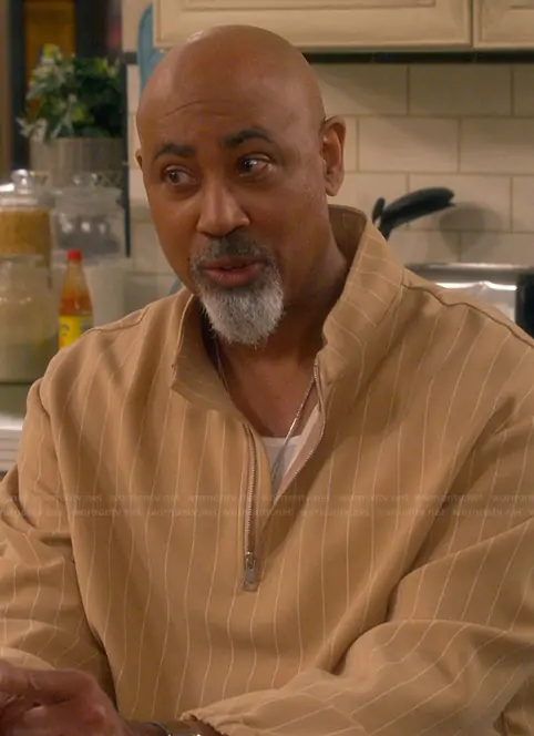 Frank (played by Lamont Thompson) on The Upshaws on Netflix was spotted wearing this khaki pinstripe jacket and pants on The Upshaws on episode 'Help Less' (7x11) in Jan 2026. Frank's Jacket is the Pinstripe 1/4-Zip Track Jacket by Mode of One . Frank's Pants is the Regular-Fit Pinstripe Track Pants by Mode of One.