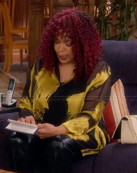 Althea (played by Kym Whitley) on The Upshaws on Netflix was spotted wearing this brushstroke print top on The Upshaws on episode 'Help Less' (7x11) in Jan 2026. 's Top is the Metallic Print Tunic by Donna Karan.