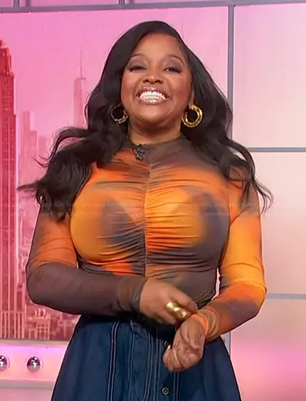 Sherri Shepherd on Sherri on FOX was spotted wearing this orange tie dye mesh top on Sherri on Jan 23 2026's episode. Sherri's Top is the Gem Top by By Dyln . Sherri's Skirt is the Denim High-Low Asymmetric Raw-Hem Skirt by Pilcro.