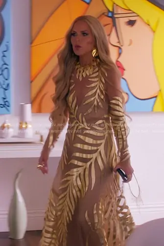 Rachel Zoe on The Real Housewives of Beverly Hills on Bravo was spotted wearing this gold leaf sheer maxi dress on The Real Housewives of Beverly Hills on episode 'Star Signs and Bad Times' (15x06) in Jan 2026. Rachel's Dress is the Metallic Leaf Maxi Dress by Valentino.