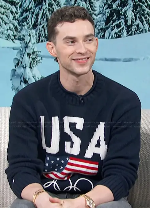 on Access Hollywood on NBC was spotted wearing this navy USA Olympics sweater on Access Hollywood on Jan 23 2026's episode. 's Sweater is the Team USA Wool-Blend Rollneck Sweater by Ralph Lauren.