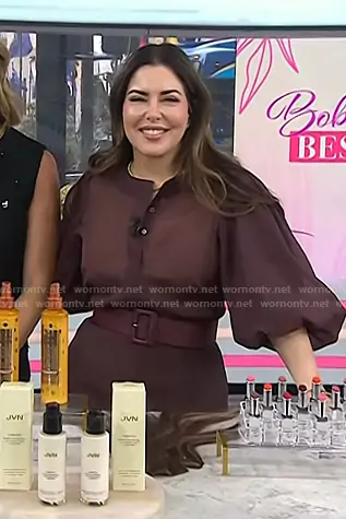 Bobbie Thomas on Today on NBC was spotted wearing this burgundy puff sleeve blouse on Today on Jan 23 2026's episode. Bobbie's Top is the Liza Organza Puff Sleeve Top in Mahogany by Le Bop . Bobbie's Skirt is the Olivia Organza Skirt in Mahogany by Le Bop.