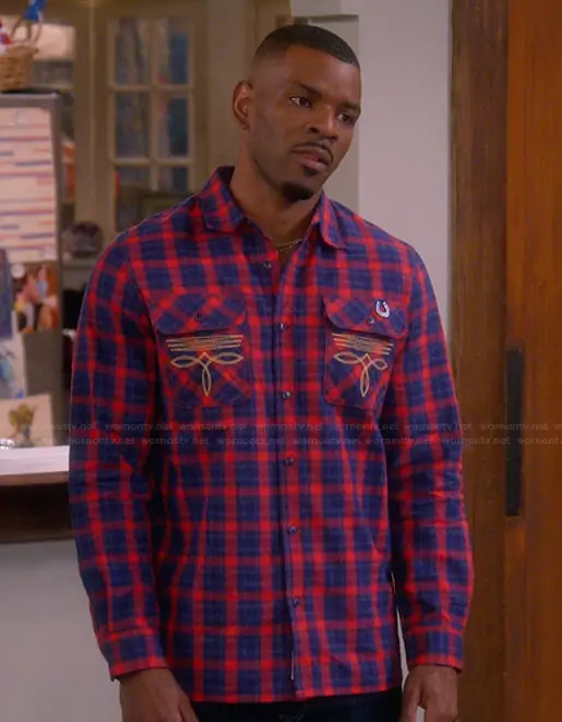 Bernard Upshaw Jr (played by Jermelle Simon-Jones) on The Upshaws on Netflix was spotted wearing this blue plaid western shirt on The Upshaws on episode 'Bon Voyage' (7x12) in Jan 2026. Bernard's Shirt is the Dust Embroidered Plaid Flannel Button-Up Shirt by Billionaire Boys Club.