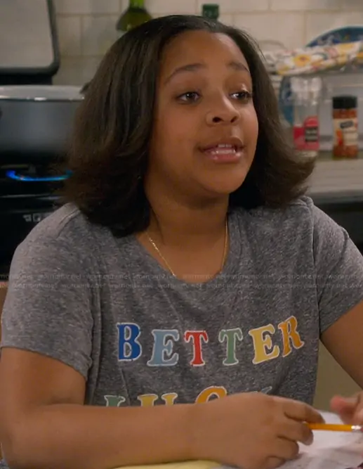 Maya Upshaw (played by Journey Christine) on The Upshaws on Netflix was spotted wearing this gray better luck print tee on The Upshaws on episode 'Bon Voyage' (7x12) in Jan 2026. Maya's Top is the The Boxy Goodie Goodie Tee by Mother.