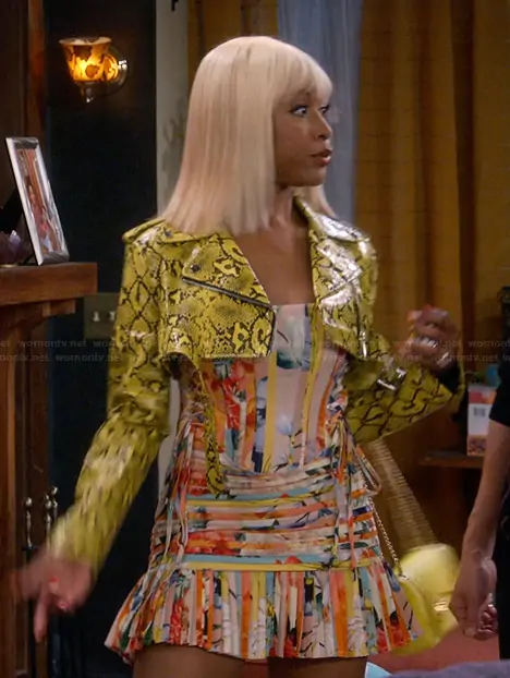 Tasha (played by Gabrielle Dennis) on The Upshaws on Netflix was spotted wearing this printed corset dress and jacket on The Upshaws on episode 'Bon Voyage' (7x12) in Jan 2026. 's Dress is the Flounce Corset Mini Dress by Akira . 's Jacket is the Sylvette Ultra Crop Moto Jacket by Akira.