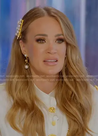 Carrie Underwood on American Idol on ABC was spotted wearing this pearl earrings and hairclips on American Idol on Jan 27 2026's episode. Carrie's Earrings is the Orion Pearl Orbit Earrings by Ariel Taub . Carrie's Hairclips is the Kimberly Pearl Hairclip by Ariel Taub.