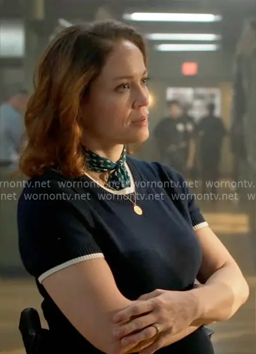 Angie Polaski (played by Erika Christensen) on Will Trent on ABC was spotted wearing this navy short sleeve sweater with white trims on Will Trent on episode 'The Man From Nowhere' (4x04) in Jan 2026. Angie's Top is the Carolyn layered sweater-tee in merino wool by J. Crew.