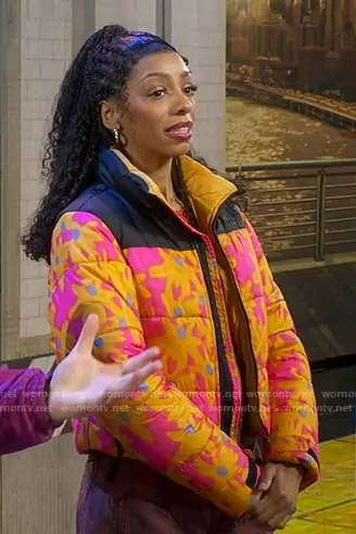 on Good Morning America on ABC was spotted wearing this orange floral down jacket on Good Morning America on Jan 27 2026's episode. 's Jacket is the Saikuru Cropped Puffer in yellow flower print by The North Face.