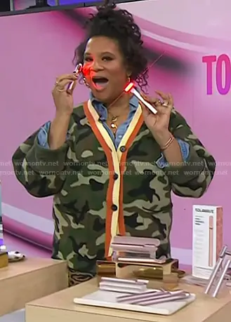 on Today on NBC was spotted wearing this camo print cardigan on Today on Jan 28 2026's episode. 's Sweater is the The Slouchy Cardigan in Olive Camo by KBB by KAHLANA.