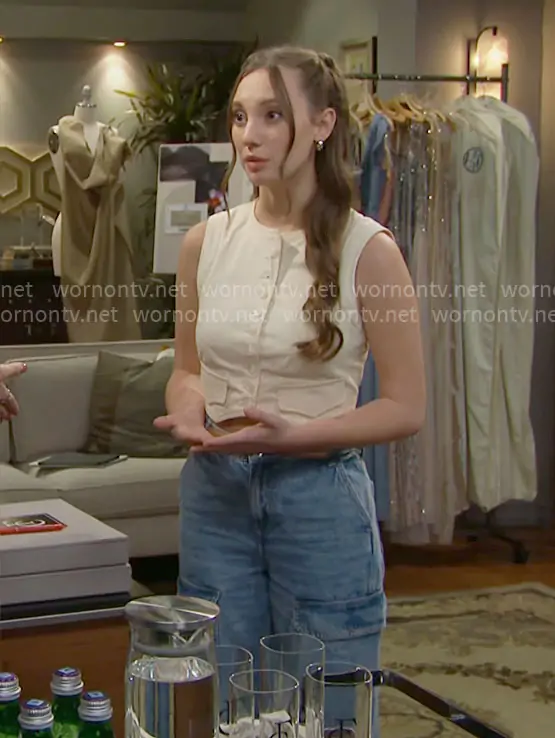 Miss Dylan (played by Sydney Bullock) on The Bold and the Beautiful on CBS was spotted wearing this cream vest on The Bold and the Beautiful on Jan 28 2026's episode. 's Top is the Crewneck Cropped Vest by Avec Les Filles.