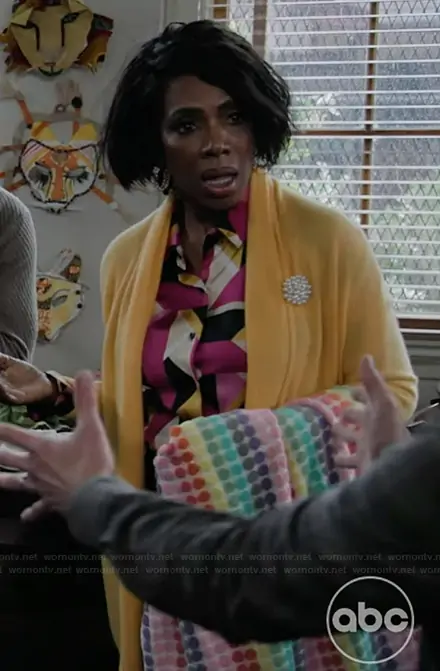 Barbara Howard (played by Sheryl Lee Ralph) on Abbott Elementary on ABC was spotted wearing this abstract print blouse on Abbott Elementary on episode 'Picture Day' (5x12) in Jan 2026. Barbara's Top is the Oversized Printed Button-Down Top by Karl Lagerfeld Paris.