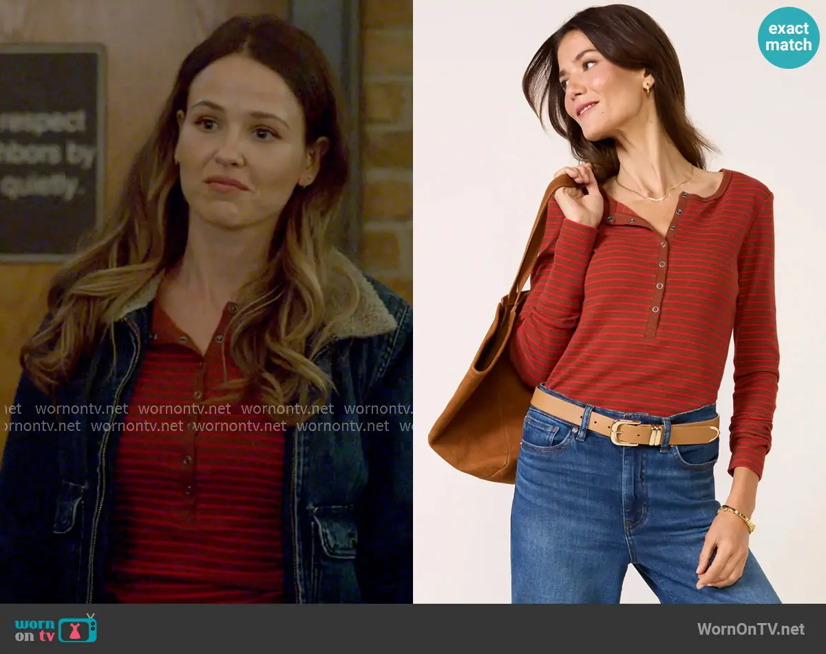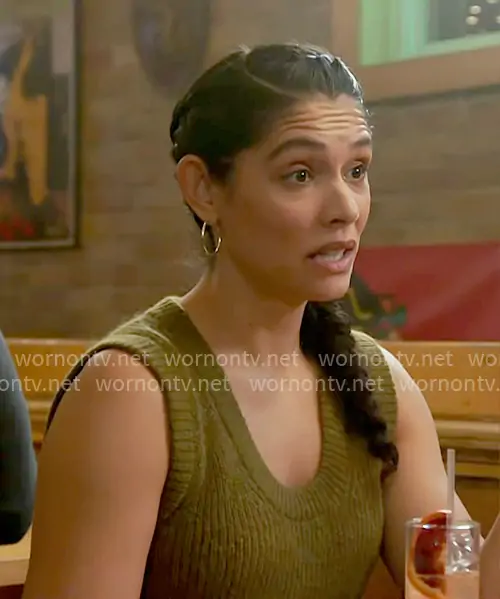 Stella Kidd (played by Miranda Rae Mayo) on Chicago Fire on NBC was spotted wearing this green knit tank top on Chicago Fire on episode 'Frostbite Blue' (14x11) in Jan 2026. Stella's Top is the Jovanna Sweater Tank in Moss by Veronica Beard.