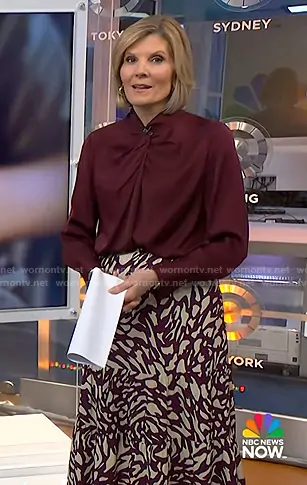 Kate Snow on NBC News Daily on NBC was spotted wearing this burgundy blouse and abstract print skirt on NBC News Daily on Jan 29 2026's episode. Kate's Top is the Lola Silk-Blend Blouse in Noir Berry by Elie Tahari . Kate's Skirt is the Gianna Tiered Ruffle Skirt by Ba&Sh.