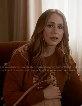 Maddie Kendall (played by Jennifer Love Hewitt) on 9-1-1 on ABC was spotted wearing this brown Lucky print sweater on 9-1-1 on episode 'Handle with Care' (9x10) in Jan 2026. Maddie's Sweater is the Lucky Crewneck Sweater in Shale Angel by Jumper 1234 . Maddie's Bag is the Hana Leather Shoulder Bag by See by Chloe.