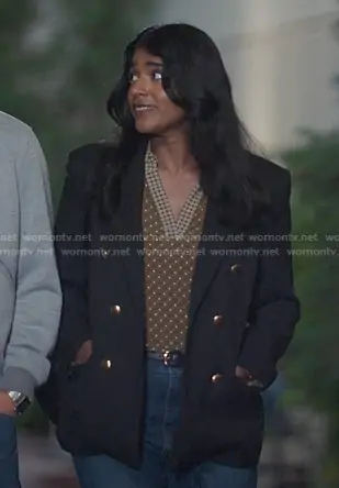 Kavita Mohanty (played by Anita Kalathara) on Greys Anatomy on ABC was spotted wearing this Kavita’s khakie printed v-neck top on Greys Anatomy on episode 'Strip That Down' (22x10) in Jan 2026. 's Top is the Foulard Johnn Collar Top by Tommy Hilfiger.