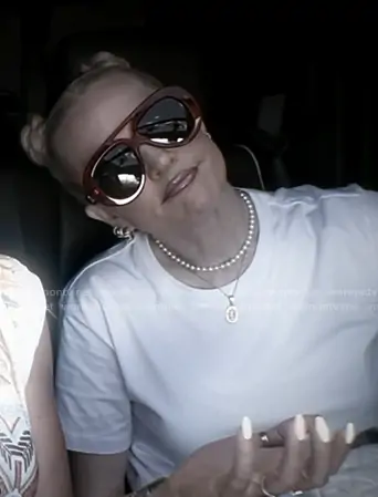 Erika Jayne on The Real Housewives of Beverly Hills on Bravo was spotted wearing this red ropund aviator sunglasses on The Real Housewives of Beverly Hills on episode 'Headlines and Heartbreak' (15x07) in Jan 2026. Erika's Sunglasses is the Round Spoiler Aviator Sunglasses by Loewe.