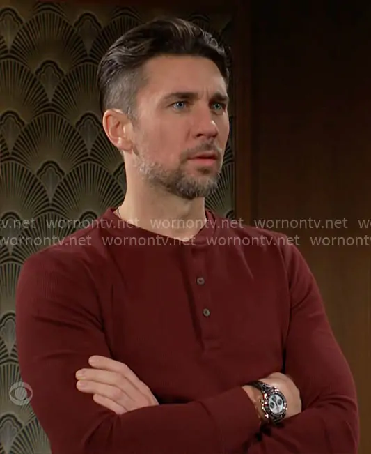 Cane Ashby (played by Billy Flynn) on The Young and the Restless on CBS was spotted wearing this red henley shirt on The Young and the Restless on Jan 30 2026's episode. Cane's Shirt is the Waffle Knit Thermal Henley by Banana Republic.