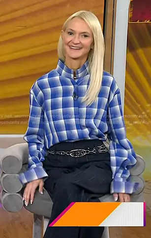 on Today on NBC was spotted wearing this blue plaid shirt and striped pants on Today on Feb 02 2026's episode. 's Top is the Plaid Viscose Shirt in blue / ivory by Tory Burch . 's Pants is the Wide-Leg Wool Pant in dark navy / copper by Tory Burch . 's Belt is the Pierced Studded Belt in Black by Tory Burch.