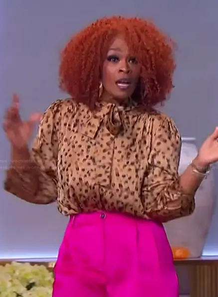 on The Jennifer Hudson Show on FOX was spotted wearing this Olivia Crimmins’ leopard print tie neck blouse on The Jennifer Hudson Show on Jan 26 2026's episode. 's Top is the Evelyn tie neck blouse in leopard by Pinch.
