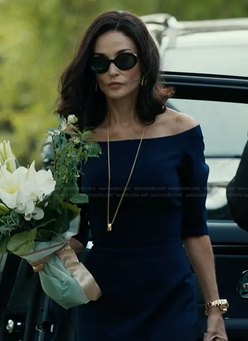 Cami Miller (played by Demi Moore) on Landman on Paramount was spotted wearing this navy off shoulder dress on Landman on episode 'Dancing Rainbows' (2x04) in Dec 2025. Cami's Dress is the Off-Shoulder Midi Dress by Carolina Herrera . Cami's Earrings is the Morrell Drop Huggie Earrings by Walters Faith . Cami's Watch is the Reflection De Cartier Watch by Cartier . Cami's Bag is the Milano Two Handles Medium Bag by Valextra . Cami's Ring is the White Gold and Diamond Caresse d'Orchidees Ring by Cartier.