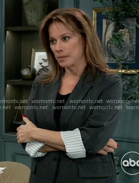 Alexis Davis (played by Nancy Lee Grahn) on General Hospital on ABC was spotted wearing this pinstripe blazer on General Hospital on Feb 02 2026's episode. Alexis's Jacket is the Pinstripe three-quarter-sleeve blazer by Rag and Bone .