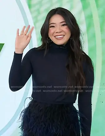 on Today on NBC was spotted wearing this navy turtleneck sweater and feather skirt on Today on Feb 03 2026's episode. 's Sweater is the Fine Gauge Cashmere & Silk Turtleneck Sweater by Akris . 's Skirt is the Feather Front Wool Blend Pencil Skirt by Akris.