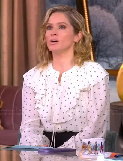 Sara Haines on The View on ABC was spotted wearing this white printed ruffle blouse on The View on Feb 03 2026's episode. Sara's Top is the Gomez Ruffle Print Shirt by Veronica Beard.