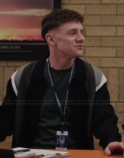 Jacob Hill (played by Chris Perfetti) on Abbott Elementary on ABC was spotted wearing this striped cardigan on Abbott Elementary on episode 'Candygrams' (5x13) in Feb 2026. Jacob's Sweater is the Stripe Collar Cardigan by Mnml.