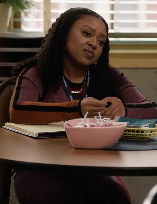Janine Teagues (played by Quinta Brunson) on Abbott Elementary on ABC was spotted wearing this colorblock long sleeve dress on Abbott Elementary on episode 'Candygrams' (5x13) in Feb 2026. Janine's Dress is the Nora Midi Dress by Toccin.