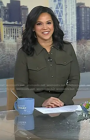 Laura Jarrett on Today on NBC was spotted wearing this green flap pocket blouse and pants on Today on Feb 05 2026's episode. Laura's Top is the Pepper Button-Down Blouse in Cypress by Veronica Beard . Laura's Pants is the Cole Pants in Cypress by Veronica Beard.