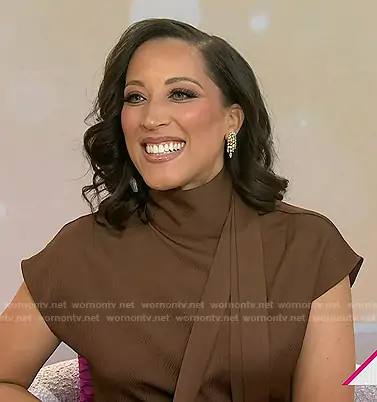 on Today on NBC was spotted wearing this brown tie neck top and gathered skirt on Today on Feb 05 2026's episode. 's Top is the Charmeuse Ribbon Neck Blouse in Brown by Edeline Lee . 's Skirt is the Charmeuse Maxi Skirt in Brown by Edeline Lee.
