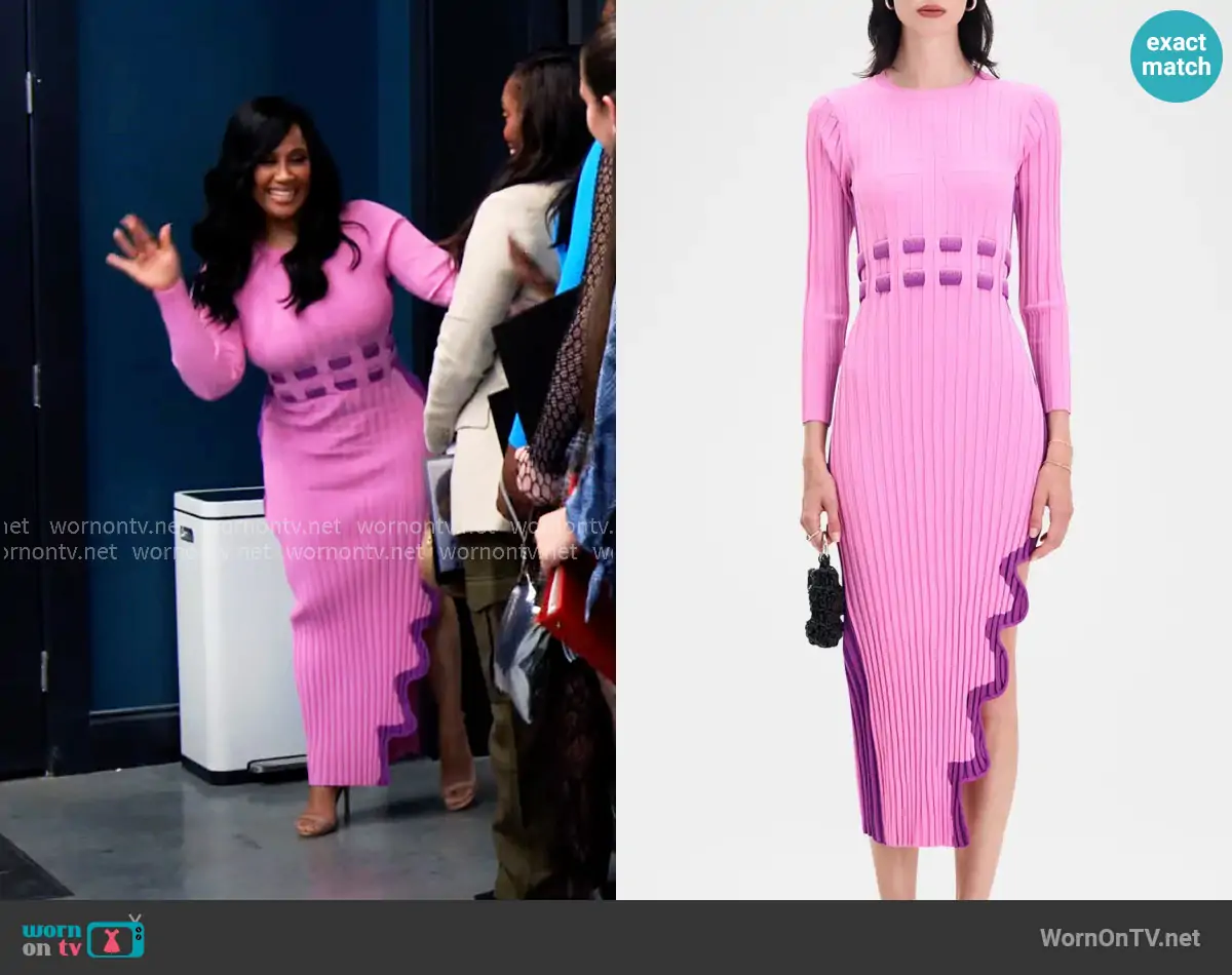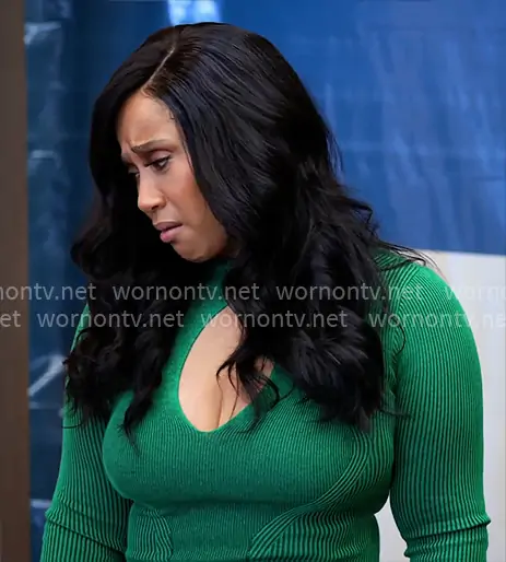 Pam (played by Angie Beyince) on Tyler Perrys Sistas on BET was spotted wearing this green rib knit dress with keyhole cutout on Tyler Perrys Sistas on episode 'Misery Loves Company' (10x05) in Feb 2026. Pam's Dress is the About You Midi Dress in Green by Akira.