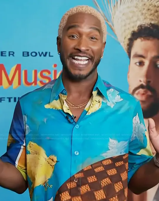 Scott Evans on Access Hollywood on NBC was spotted wearing this Scott printed satin shirt on Access Hollywood on Feb 06 2026's episode. Scott's Shirt is the Damier Printed Short Sleeve Shirt Bird Motif by Louis Vuitton.