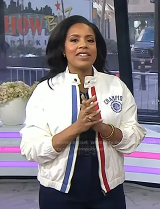 Sheinelle Jones on Today on NBC was spotted wearing this ivory stripe trim jacket on Today on Feb 06 2026's episode. Sheinelle's Jacket is the Game Day Full Zip Top in Cream by Champion.