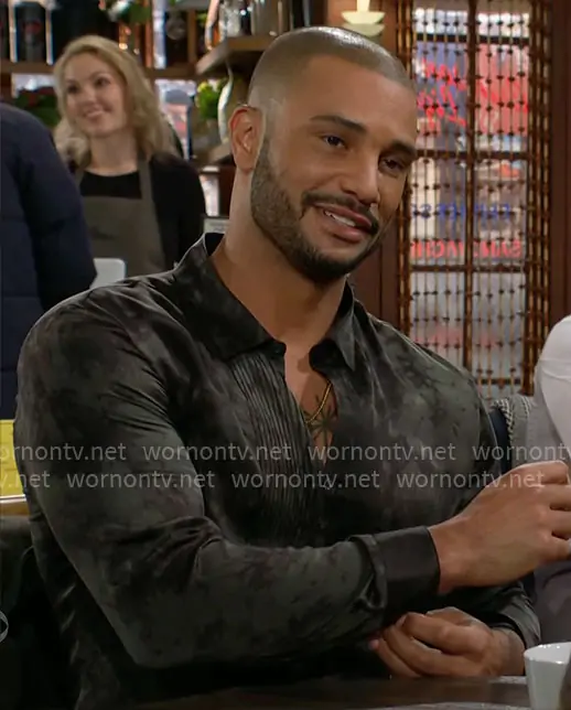Holden Novak (played by Nathan Owens) on The Young and the Restless on CBS was spotted wearing this tie dye pintuck shirt on The Young and the Restless on Feb 06 2026's episode. Holden's Shirt is the Pleated Front Silk Button-Up Shirt by John Varvatos.