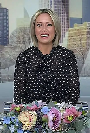 Dylan Dreyer on Today on NBC was spotted wearing this black polka dot tie neck blouse on Today on Feb 06 2026's episode. Dylan's Top is the Dot Pleat Bow Blouse by Michael Kors.