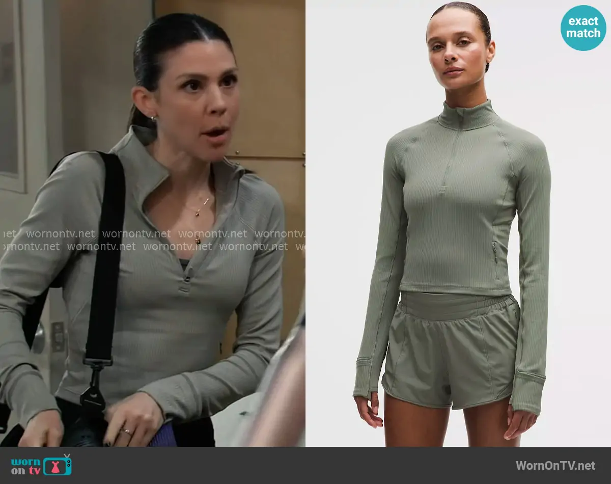 Kristina Corinthos-Davis (played by Kate Mansi) on General Hospital on ABC was spotted wearing this sage green zip top on General Hospital on Feb 06 2026's episode. Kristina's Top is the It's Rulu Ribbed Cropped Half Zip in Willow Leaf by Lululemon .