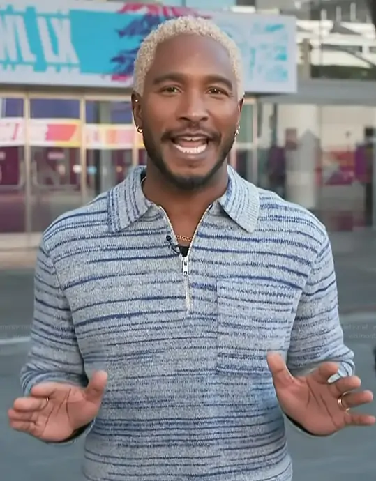 Scott Evans on Access Hollywood on NBC was spotted wearing this striped polo sweater on Access Hollywood on Feb 06 2026's episode. Scott's Sweater is the Alpha Random Space Dye Zip Polo Sweater by Wax London.