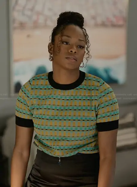 Izzy Letts (played by Jazz Raycole) on The Lincoln Lawyer on Netflix was spotted wearing this contrast knit top on The Lincoln Lawyer on episode 'Baja' (4x02) in Feb 2026. Izzy's Top is the Leo Abstract Short Sleeve Sweater by Zankov.